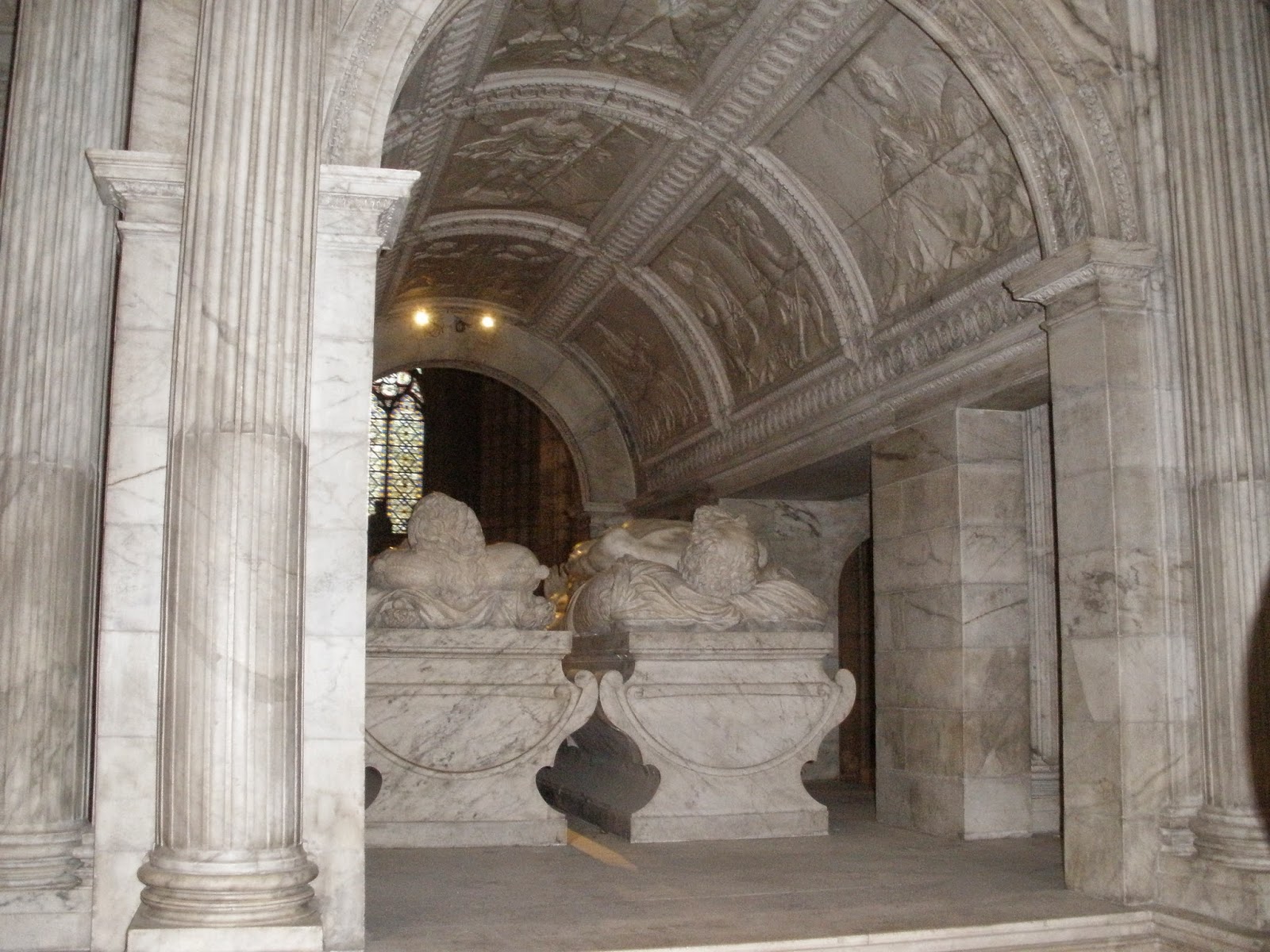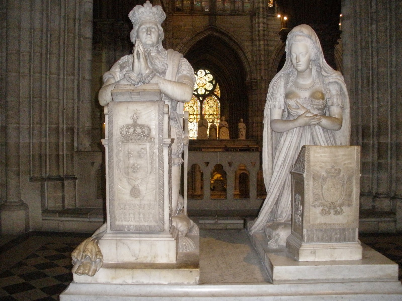 Louis XVI and his wife, Marie Antoinette at prayer,representations in main chapel of Saint Denis Finally, for this post about "tidbits" that make me shiver, I give you the picture I took of the statues of Louis XIV and his wife, Marie Antoinette. These two kneel in prayer inside the famed cathedral of Saint Denis. Located in the Paris suburbs, this gothic cathedral is the first example of gothic architectural developments. A marvel to see (and I will post in future a complete blog about our visit to this stunning church), Saint Denis was redone in gothic form beginning in the early 12th century. The other reason you want to take the Metro to view this marvelous cathedral is that it is the church where all kings of France are buried. Yes, all. Many are accompanied by their queens and children, some very young and others older.