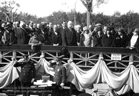 La imagen corresponde al desfile del 8 de octubre de 1927, en la celebración anual del Día de la Policía Federal. La celebración se había instaurado el año anterior. Vemos en el palco oficial al presidente de la Nación, Marcelo Torcuato de Alvear, con el sombrero en la mano. Como todos están descubiertos, incluso el chico, y los policías hacen la venia, es posible que esté ejecutándose el Himno Nacional Argentino. A la derecha del presidente, con abrigo claro, puede verse a la Primera Dama, Regina Pacini.