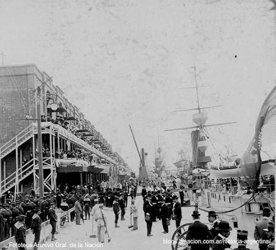 Si bien hay mucho para contar acerca de primera visita protocolar de un mandatario brasileño y la magnífica recepción, deseamos reflejar dos imágenes, de la colección del Archivo General de la Nación, que muestran un Puerto Madero acondicionado para la ocasión. Fue la vez en que las damas acudieron a los depósitos del puerto, terreno exclusivo de los estibadores, para recibir al mandatario (el 25/10) y despedirlo (el 1/11).