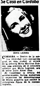 “Dentro de la mayor intimidad tuvo realización ayer en esta ciudad el enlace de la señorita Mirtha Martínez Suárez, más conocida en el ambiente artístico por Mirtha Legrand, con el señor Julio Alvar Díaz. Al trascender la noticia del acontecimiento, fueron numerosas y expresivas las demostraciones de felices augurios que recibió la consagrada figura de la cinematografía”.