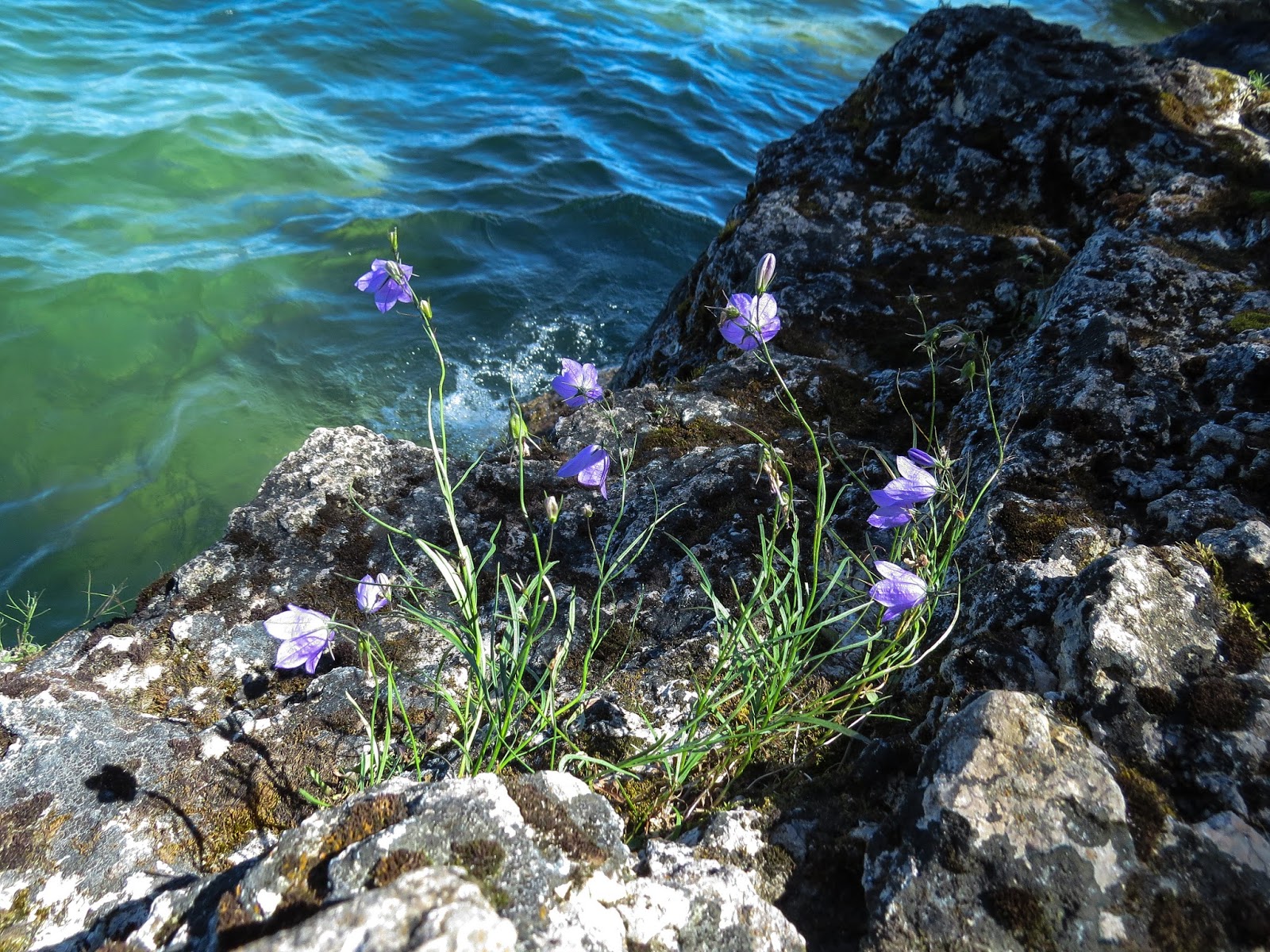 Two views of the Common Harebells that were all over the Caves Trail at Clearwater Lake PP. The first is a typical clump at the shoreline. The other is from a cave-side and, while it's a terrible photo of the Harebell, it works as a pic of the lichen on the rock behind...