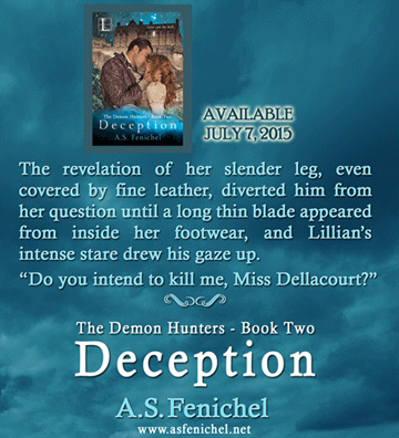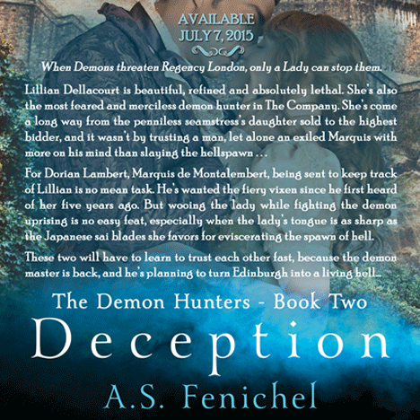 Gripping the chair arms to keep herself seated, Lillian fought an urge to leave and never set foot inside Castle Brendaligh again.It had been a demoralizing battle and they had lost, but they had lived. They had done all they could, but still the demon master had ascended into man’s world.“You failed and we are all likely to die because of it. I hold every person at this table responsible for the state of England. You have ruined us.” Lord Clayton’s voice grated on Lillian’s nerves.Accounts of the battle were clear. Nearly everyone in the room had risked their lives trying to disrupt the ascension, not to mention keep the earl’s daughter, Belinda, from becoming a demon sacrifice. Making such a show of ferocious reprimands insulted their brave and selfless efforts. If not for the fact that he was her best friend’s father, she might have indulged her desire to pull a sai blade from her boot and slice his throat.As if Lord Clayton, the Earl of Shafton, needed to attract more attention, he waved his hands. “You had one mission, to keep the master from entering our world. All you had to do was kill one demon, but you failed. You should all be shot for treason. Treason!”His bright red face gave her hope his heart might fail and save her the trouble of killing him. Other hunters at the table murmured, but no one spoke out.Everyone in this room is to blame. You had the perfect opportunity to end this mess. Nowthe master is free of his realm and living in ours. It’s only a matter of time before he is strong enough to destroy everything we hold dear. When your families are killed mercilessly, will you sit here so unrepentant about failing in your duty?”“Father, really.” Belinda Thurston rolled her eyes.Lillian missed Reece’s steadying presence. Reece might have even been able to stop his lordship’s tirade with a few quick-witted remarks. Her partner had nearly died, and now lay upstairs recovering from demon poisoning.“Don’t you roll your eyes at me, Belinda. You are equally to blame. You were with the master for days and made no attempt to destroy him.”Gabriel, Belinda’s husband, bristled. It was of course a ridiculous statement. The Earl of Tullering was not used to public abuse of his family. “Just a minute, my lord. You are out of order. Belinda was in no position to defeat the demon master. The information she gathered will be very helpful in our eventual victory.”Shafton pointed a fat finger. “I do not want to hear about information that will take years to decipher. You, Tullering, are by far the most culpable. You and that woman”—he pointed at Lillian—“made a conscious choice not to destroy the master.”Lillian reached toward her boot and let the hard steel of her sai blade handle bring her comfort. One second and Shafton’s head could be rolling down the long table and land in Drake Cullum’s lap.Besides Shafton, Drake and his assistant, Dorian Lambert, were the only ones present who had not been at the battle. Their leader, Drake, had attended to assign new orders to the hunters.Shafton said, “You could have destroyed the beast as it rose and was weakened. I know you had the opportunity, but you chose to save yourself. It was selfish and stupid.”Lillian could kill him and no one would be able to stop her. Of course, there were always consequences when dealing with men in power. She’d lose her home within The Company. Yet another arrogant earl would not take her from her rightful place. She was in control. It was nothing like her youth and the titled man who’d ruined her life.Belinda said, “They saved my life, Father.” “It was the wrong choice, Belinda. You might have cost us our one chance to stop this.” Shafton narrowed his eyes on Lillian. Lillian said, “I can imagine your pleasure if we had allowed your only child to become the master’s sacrifice. Perhaps we should have stood by and watched until the master, with his full power rose, from the depths of hell and destroyed us all. As it is, Reece Foxjohn is still recovering from battle and the rest of us might have been sucked into the demon’s realm. But by all means, my lord, go on and tell us how you know we willfully failed on our mission. I do not recall your life being in danger that day at Fatum Manor. You were safely tucked away in your castle while the rest of us faced death or worse.”“You are out of order, Dellacourt.” Shafton said her name as if it were a curse.Lillian wasn’t sure when she had stood up, but clutching the leather wrapped steel, she rounded the table toward the earl. “If you have something you want to say about my abilities, my lord, I suggest you do so. I will be happy to display them for you, and we can evaluate them together.”“Miss Dellacourt.” A warning came from the other end of the table.“You were not there. You cannot know if we could have destroyed the master. As far as I’m concerned, we made the only choice possible under the circumstances. Maybe if your intelligence had supplied us with the location of the gateway before the master had grown so powerful, we might have been able to seal him in.”“How dare you imply that I failed in some way? You who completely disregard orders at will.” She had only ever hated one man the way she despised Shafton, and he too was an earl. At least that one was dead. Steeling her nerves, she slid the sai blade through the pocket cut in her skirt. “You speak of orders that were selfish and almost succeeded in getting your own family killed.”“You have no right to question me or my motives.” To his credit, he faced her and stared her in the eye.“I have every right when you point your fat finger at me.”“Who do you think you are? I know where you come from Lillian Dellacourt. I know what you are.”Drake Cullum pounded the table. “Shafton, that will do.” The demon hunters’ leader stood rigid, narrow-eyed. He was formidable when he was calm, but enraging him 