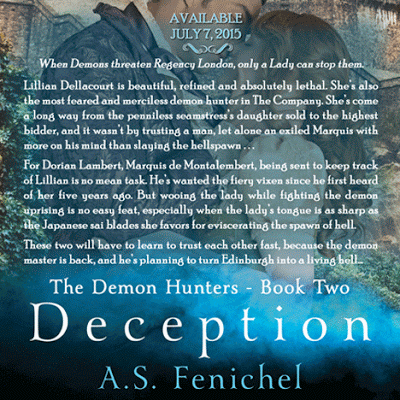 For Dorian Lambert, Marquis de Montalembert, being sent to keep track of Lillian is no mean task. He’s wanted the fiery vixen since he first heard of her five years ago. But wooing the lady while fighting the demon uprising is no easy feat, especially when the lady’s tongue is as sharp as the Japanese sai blades she favors for eviscerating the spawn of hell.