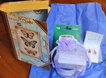 1 Dream, Hope, Laugh, Believe book-shaped box 1 pair handmade earrings 1 Lavender Lovers Collection - Handmade Spa Gift Set with French Lavender Soap, Shea Butter and Lip Balm $15 Starbucks gift card