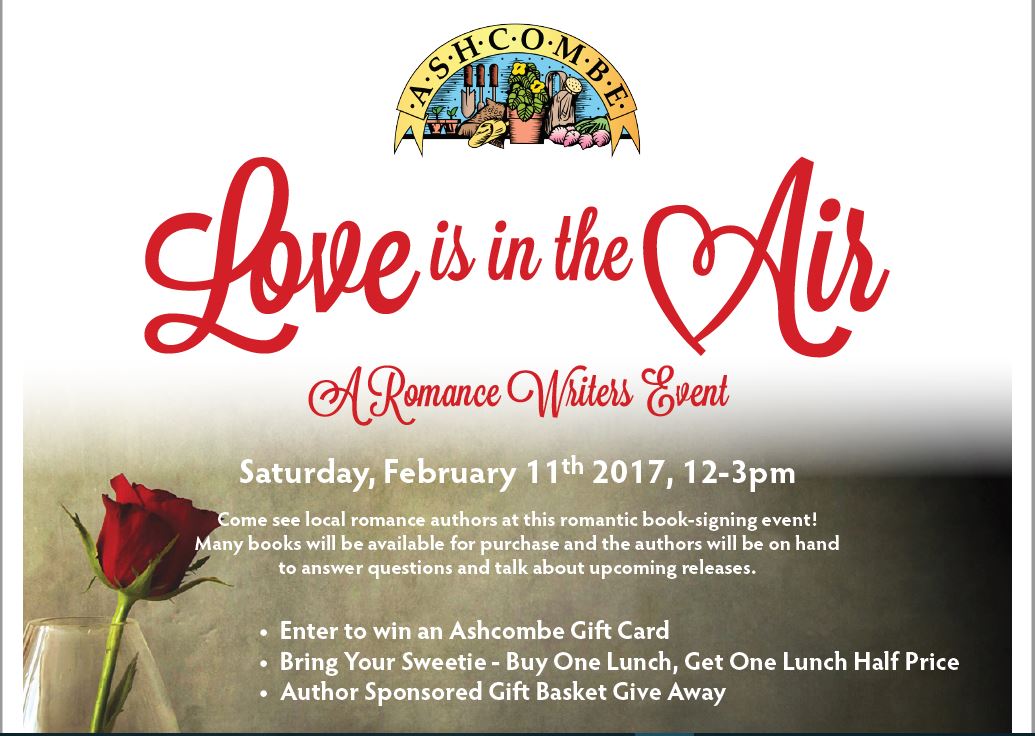 On Saturday, Feb. 11, come out to Ashcombe Farm and Greenhouse in Mechanicsburg for a sweet event!I'm one of 19 authors with books on hand at the Love Is In The Air annual signing. Not only will you find some amazing books, but you can enter to win a gift basket full of author goodies! Or you might win an Ashcombe Gift Card.