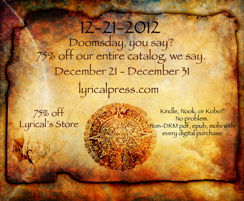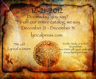 To celebrate The End of the World - NOT!, Lyrical Press is having a 75 percent off sale. Whether you're holed up in your bunker or not, it's a great time to grab some excellent reads. If I might suggest one, how about Rock Bottom, my rocking contemporary? :) At these prices, you'll want to hoard some ebooks!