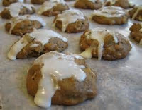 Drop dough onto greased cookie sheets about 2 inches apart. Bake for 11 to 14 minutes. While cookies are hot, spread thinly with glaze.
