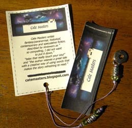 I also promised Ashley a beaded book thong. I tore through so many boxes looking for my stash of beaded book thongs, Ashley, but couldn't find them anywhere. I apologize for the delay, but I had to make the one shown below especially for you. I'm throwing in a few other bookmarks and hope it makes the extra week's wait worthwhile.