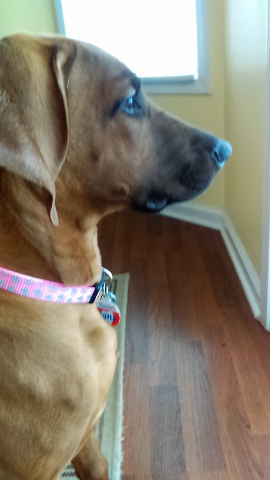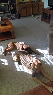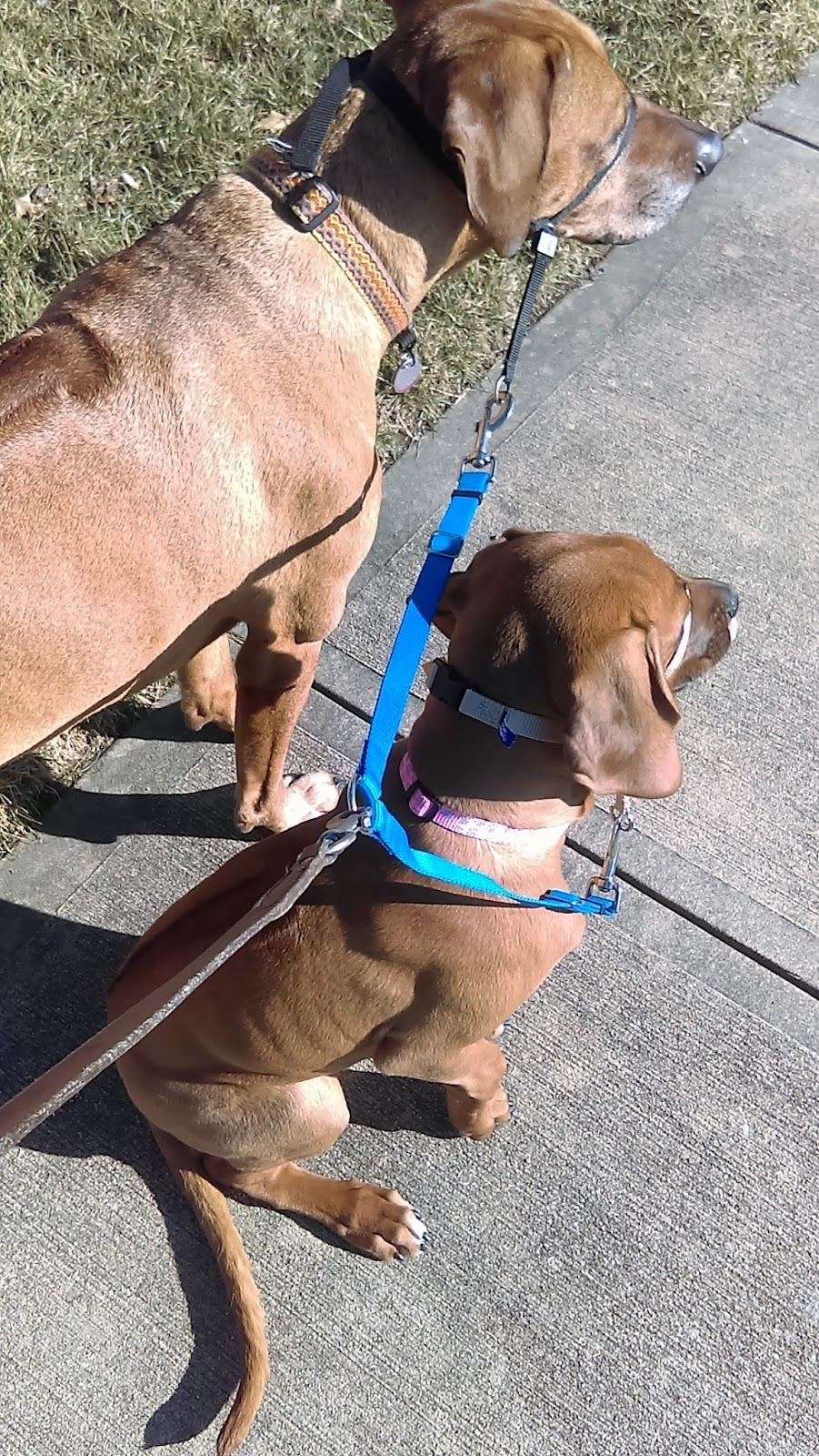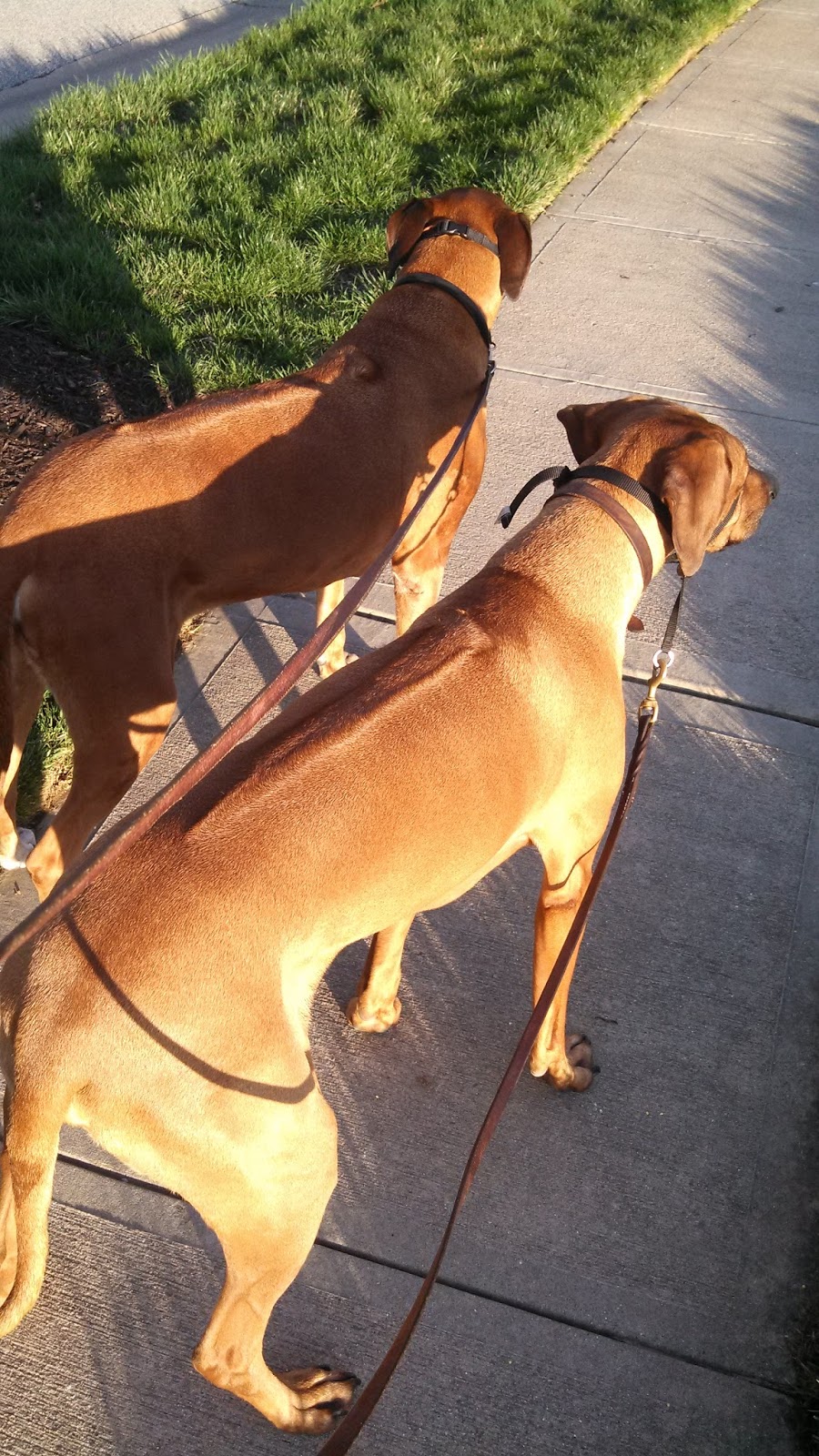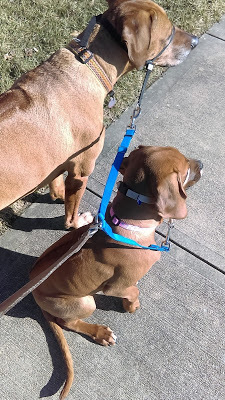 The weather over the weekend was perfect, and we went out for our first big walk. Kassi fell in beside Sunny really well (the blue harness helped keep them together, but after two walks, she didn't need it any longer), and proved what I have thought from that beginning that she was going to be a natural walker. There’s still a lot to learn, and trust me, the moment when I realized that I had two ridgebacks back on the leash and I was walking my old path was a bittersweet moment, but it was an easier transition than I had expected.