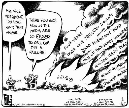 There’s the trillion-plus dollar cost, there are the thousands of American lives lost. There are the hundreds of thousands of innocent Iraqi lives lost. There’s the environmental damage, both in Iraq and through the global effect of burning many millions of gallons of needless fuel. There is the damage done to our relationship with the Islamic part of the world. There’s the damage done to our image – both in the eyes of the world and in our own eyes, as we have descended into the realms once reserved for those we ourselves termed, “war criminals.”