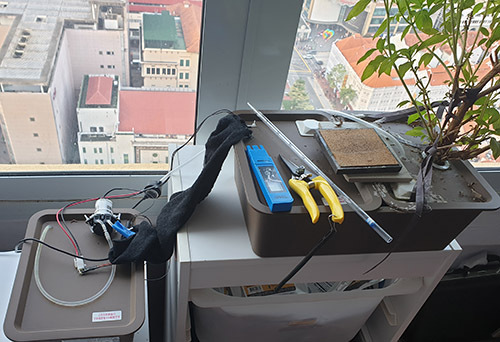 The current “automated” system, consisting of a reservoir on the left, with a peristaltic pump on top of the reservoir bin, and two float switches. The silicone tube that takes the solution from the reservoir to the plant bin is covered by an old sock to prevent algae from growing in the solution when it’s not moving. There is also an aeration pump, not visible in this photo.