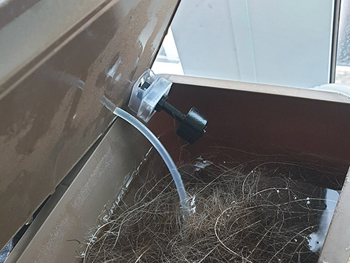 The float switch mounted on the top, functioning as a “break-when-full” switch. You can see the plant’s roots have taken over the entire bin! A couple of spacers were also added to adjust the height of the water.