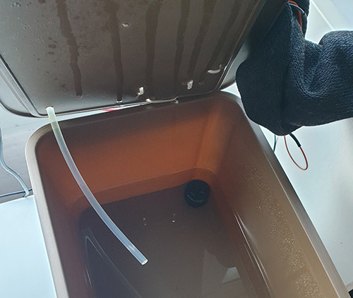 The float switch mounted on the bottom of a tank, functioning as a “break when empty” switch. In order to provide clearance for the switch on the bottom, a couple of wine corks were hot-glued to the bottom of the bin. The switch comes with a rubber o-ring, creating an effective seal and no leakage.
