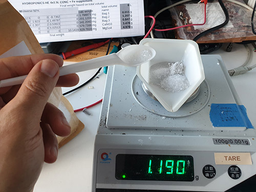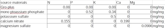 That left me with purchasing a set of salts and trying to calculate, from first principles, the ratios that I needed to add to my hydroponics bins. The salts I finally decided on purchasing are: