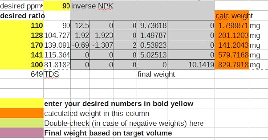 As a sanity check, I plug the calculated weights back into the forward matrix to make sure I didn’t mess up the math, and I also add up all the dissolved solids to a TDS (total dissolved salts) number, so I can cross-check the resulting solution easily using a cheap TDS meter (link without referral code). In case you want to start from a template, you can download the spreadsheet. The template contains the pre-computed ratio that I currently use for growing all my herbs with compounds that I can source easily from the local market, and it seems to work fairly well for plants ranging from brazilian spinach to basil to sage.