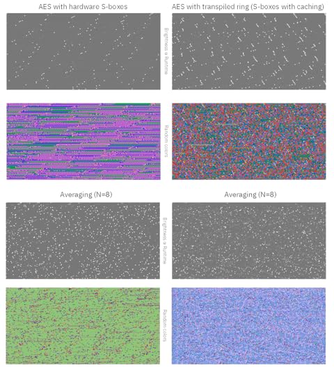 Each graphic above shows a plot of runtime versus 256 keys (horizontal axis) versus 128 data values (vertical axis) (similar to figure 8.1 in the above-cited paper). In the top row, brightness corresponds to runtime; the bright spots correspond to periodic OS interrupts that hit in the middle of the AES processing routine. These bright spots are not correlated to the AES computation, and would average out over multiple runs. The next lower row is the exact same image, but with a random color palette, so that small differences in runtime are accentuated. Underneath the upper 2×2 grid of images is another 2×2 grid that corresponds to the same parameters, but averaged over 8 runs.