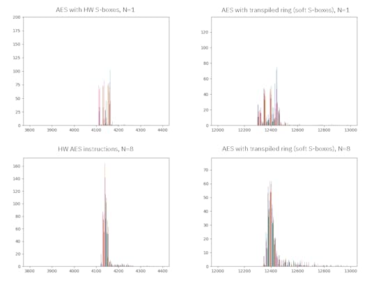 Above is a histogram of the same data sets; on the left are the hardware S-boxes, and the right is the software S-box used in the `ring` transpilation; and across the top are results from a single run, and across the bottom are the average of 8 runs. Here we can see how on a single run, the data tends to bin into a couple of bands, which I interpret as timing differences based upon how “warm” the cache is (in particular, the I-cache). The banding patterns are easily disturbed: they do not replicate well from run-to-run, they tend to “average out” over more runs, and they only manifest when the profiling is very carefully instrumented (for example, introducing some debug counters in the profiling routines disrupts the banding pattern). I interpret this as an indicator that the banding patterns are more an artifact of external influences on the runtime measurement, rather than a pattern exploitable in the AES code itself.