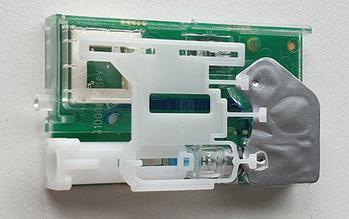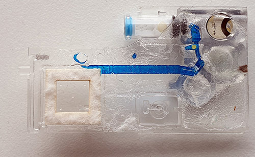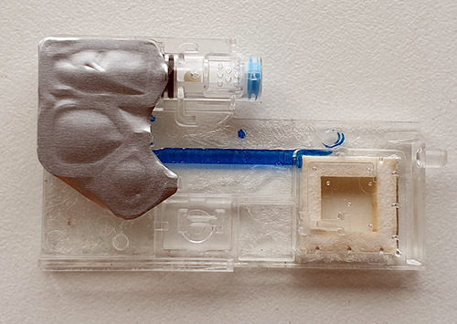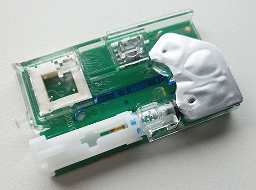 The small bit of research I did on the device indicates it uses LAMP for amplification, so the device runs at an elevated but constant temperature, and the results are read out using an electrochemical method. Basically, the reagents are mixed with the sample, and they are pumped through a small channel (lined with some kind of blue film) that goes over gold-plated electrodes on the circuit board. The reaction presumably changes some sort of electrically measurable parameter as it evolves — conductivity, pH, impedance, something like that. I thought the round black object molded into the clear plastic assembly would be a heating element, but it also seems to be an electrode of some sort, as it measures an open circuit before the reagent mix is punctured, but has a high DC impedance once liquids are introduced to the chamber.