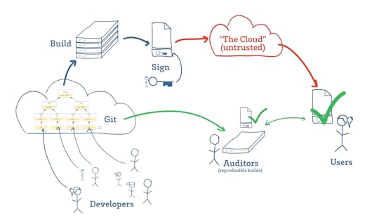 Software developers manage source code using tools such as Git (above, cloud on left), which use Merkle trees to track changes. These hash trees link code to their development history, making it difficult to surreptitiously insert malicious code after it has been reviewed. Builds are then hashed and signed (above, key in the middle-top), and projects that support reproducible builds enable any third-party auditor to download, build, and confirm (above, green check marks) that the program a user is downloading matches the intent of the developers.