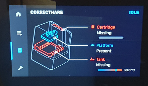 Above is an example screen from the Form 3’s integrated display. In addition to a graphical style that would be at home in Tony Stark’s lab, the image above shows off the enhanced introspection capabilities of the printer. The Form 3 is more aware of its accessories and environment than ever; for example, it now has the ability to report a missing build platform.