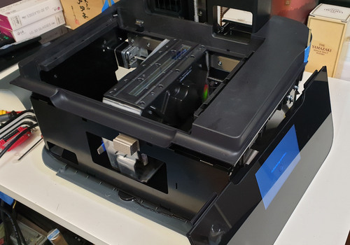 With a pair of magnets taped to the rear edges of the case to defeat the safety interlocks, I’m able to run the printer with the covers off. Overall, it looks like the printer should be pretty easy to service for basic repairs and calibration in this state. But of course, we must go further…
