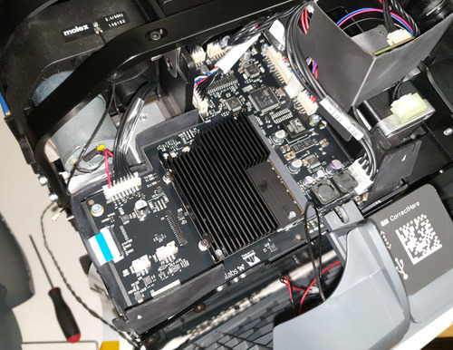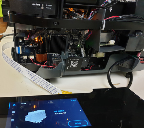 The main circuit cluster for the Form 3 is located in the rear right of the printer. After pulling off the case, a set of PCBs comprising the main SoC module and driver electronics is clearly visible. Also note the “roll bar” that spans the rear of the printer – a lot of thought went into maintaining the dimensional stiffness of a fairly massive printer that also had to survive the abuse of a delivery courier.