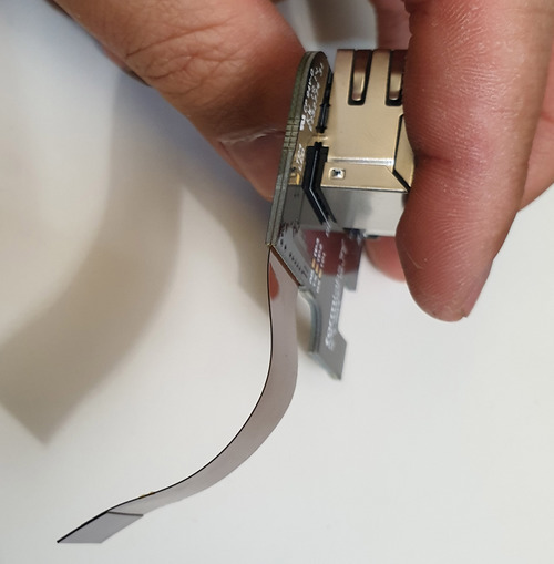The breakout board is a rigi-flex PCB. This is perhaps one of the most expensive ways I can imagine implementing this, without a ton of benefit. Usually rigi-flex PCBs are reserved for designs that are extremely space-constrained, such that one cannot afford the space of a connector. While the USB2.0 speeds at 480Mbps are fast (and the Gigabit ethernet is even slower at 4x250Mbps diff pairs), it’s not so fast that it requires a rigi-flex PCB for impedance control; in fact, the opposing side is just a regular FPC that snaps into a rather unremarkable FPC connector (there are more exotic variants that would be invoked if signal integrity was really an issue). The flex portion does look like they’ve embedded a special solid conductor material for the reference plane, but normally one would just build exactly that – a flex cable with a reference plane that otherwise goes into two plain old FPC connectors.