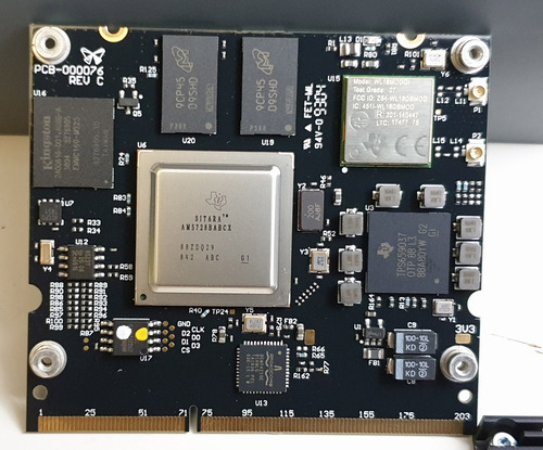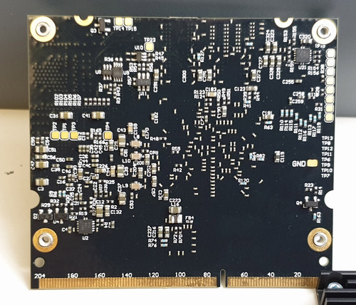Turning from the I/O connectors to the main board, we see that like the Form 2, the Form 3 splits the system into a System-on-Module (SOM) plugged into a larger breakout board. Given the clearly extensive R&D budget poured into developing the Form 3, I don’t think the SOM solution was chosen because they couldn’t afford to build their own module; in fact, the SOM does bear a Formlabs logo, and uses a silkscreen font consistent with Altium, the design tool used for all the other boards. Unlike their other boards, this PCB lacks the designer’s initials and a cute code name.