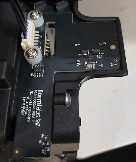 Power cycling the Form 3 causes it to exercise all its actuators as part of a self test, which gives you a nice, unobstructed view of the LPU outside of its stowage position, as shown above. Here, you can see that clearly, the galvanometer scans only in one dimension now, and that the optics look quite well sealed and protected.