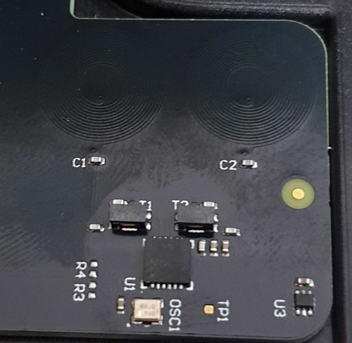 The LDC1612 and its companion spiral PCB traces sit on a small daughtercard adjacent to the resin tank. I saw at least one other use of the chip in the printer, sitting on the end of the Z-stage motor. I’d guess it was being used as some kind of position feedback on the Z-stage, except that the motor looks like a stepper and I’d imagine it already has pretty good accuracy.