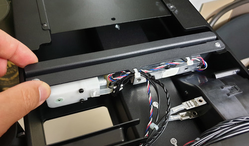 This is what the underside of the “digital scale” looks like. The top metal plate is where the resin tank sits, and the load cell is the silvery metal bar with a pair of overlapping holes drilled out of it on the right. The load-bearing connection for the top metal plate is the left hand side of the load cell, while the right hand side of the load cell is solidly screwed into the bottom metal plate. You can squeeze the two plates and see the top plate deflect ever so slightly. Load cells are extremely sensitive; this is exactly the sensor used in most precision digital scales. Accuracy and repeatability down to 10’s of milligrams is pretty easy to achieve with a load cell, so I imagine this works quite nicely to measure the amount of resin left in the tank. Just be sure not to rest any objects on top of your resin cartridge, or else you’ll throw off the reading!