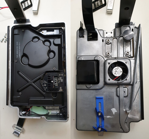 Pulling the electronics assembly out of the LPU housing is a bit of a trick. As noted previously, the optics assembly is fully-sealed. Extracting the optical unit for inspection thus required cutting through a foam tape seal between the exterior glass plate and the interior sterile environment.