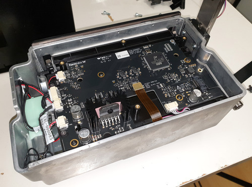 Next to the antennae was another surprise: the Ethernet and USB breakout. The I/O ports are located on a circuit board that mechanically “floats” relative to the main PCB. This probably a blend of design constraint plus concerns about how a circuit board might fare as the most rigid element bridging a flexible polymer case to a rigid steel core in a 17.5kg product that’s subject to drop-kicking by couriers.