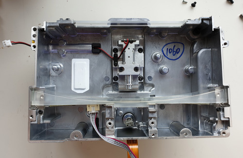 Finally, we arrive at the optics engine of the LPU. Removing the outer cover reveals a handsome optics package. The parabolic mirror is centrally prominent; immediately above it is the heat-sinked laser. Beneath the parabolic mirror is the galvanometer. Light fires from the laser, into the galvanometer, reflecting off a flat mirror (looks like a clear piece of glass, but presumably coated to optimally reflect the near-UV laser wavelength) down onto the parabolic mirror, and from there out the exit aperture to the resin tank. The white patch in the mid-left is a “getter” that helps maintain the environment within the environmentally sealed optical unit should any small amounts of contaminant make their way in.