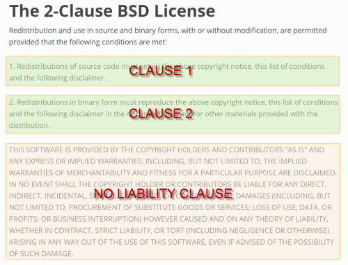 It’s taken as motherhood and apple pie in the open source software community that transparency leads to better products. The more eyes staring at a code base, the more bugs that can be found and patched. However, a crucial difference between open source software and hardware is that open source software carries absolutely no warranty. Even the most minimal, stripped down OSS licenses stipulate that contributors carry no liability. For example, the BSD 2-clause license has 189 words, of which 116 (60%) are dedicated to a “no warranty” clause – and all in caps, in case you weren’t paying attention. The no-warranty clause is so core to any open source license it doesn’t even count as a clause in the 2-clause license.