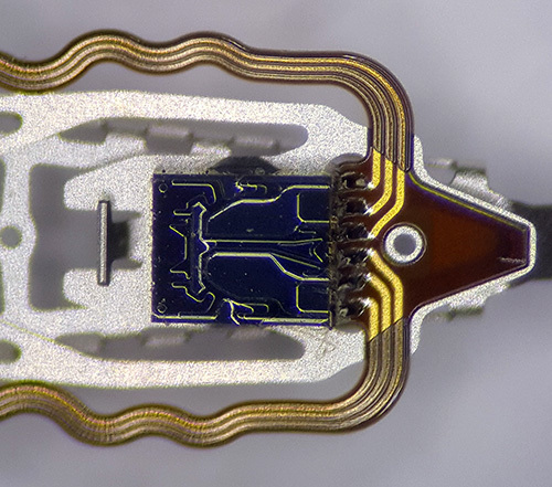 The Ware for October 2016 is a hard drive read head, from a 3.5″ Toshiba hard drive that I picked out of a trash heap. The drive was missing the cover which bore the model number, but based on the chips used on its logic board, the drive was probably made between 2011-2012. This photo was taken at about 40x magnification. Congrats to Jeff Epler for nailing the ware as the first guesser, email me for your prize!