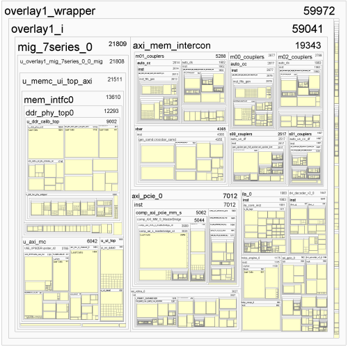 Below is the “hierarchical” view of this NeTV2 FPGA design. About 75% of the resources are devoted to the Vivado IP blocks, and about 25% to the custom NeTV application logic; altogether, the design uses about 72% of the XC7A50T FPGA’s LUT resources. A full-custom implementation of the Vivado IP blocks would save a significant amount of area, as well as be more FOSS-friendly, but it would also take months to implement an equivalent level of functionality.