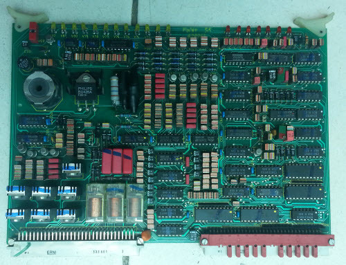Last month’s ware is a controller board for a cutting machine, made by Polar-Mohr. The specific part number printed on the board is Polar SK 020162, which I’m guessing corresponds with this machine. Henry Valta pretty much nailed it, by guessing it as a Baum SK66 cutting circuit board. I’m not quite sure what the relationship is between Baumfolder and Polar-Mohr corporation, but it seems to be close enough that they share controller boards. Congrats, email me for your prize!
