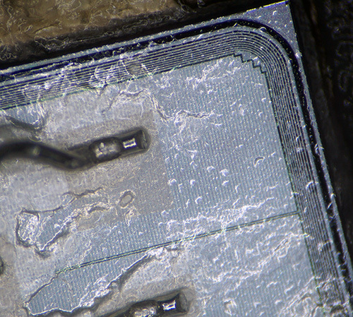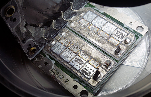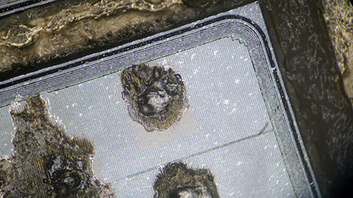 This is a little something I was gifted at Burning Man this year. I wore it around my neck for a week and then brought it back to my lab in Singapore and tore it apart. Obviously, it suffered some kind of severe trauma. I’m particularly enamored with the way the silicon melted — instead of revealing crystalline facets at the former wirebond pads, a smooth, remodeled and rather amorphous surface is revealed with rivulets of silicon radiating from the craters. Now that’s hot!