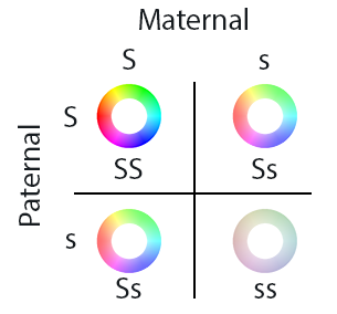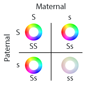 Population makeup when using saturating addition to combine the maternal and paternal saturation values. Albinism – a badge light pattern looking white or gray – happens only when both maternal and paternal values are small. ‘S’ means large saturation, and ‘s’ means little saturation. ‘SS’ and ‘Ss’ pairings of genes leads to saturated colors, while only the ‘ss’ combination leads to a net low saturation (albinism).