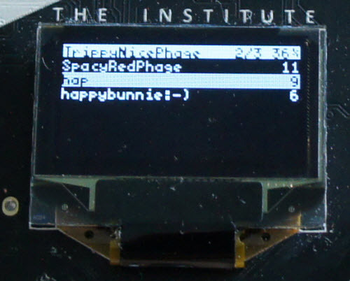 Thus, I designed a very simple protocol which will only reveal if your friends are nearby, and nothing else. Every badge emits a broadcast ping every couple of seconds. Ideally, I’d use an RSSI (receive signal strength indicator) to figure out how far the ping is, but due to a quirk of the radio hardware I was unable to get a reliable RSSI reading. Instead, every badge would listen for the pings, and decrement the ping count at a slightly slower average rate than the ping broadcast. Thus, badges solidly within radio range would run up a ping count, and as people got farther and farther away, the ping count would decrease as pings gradually get lost in the noise.
