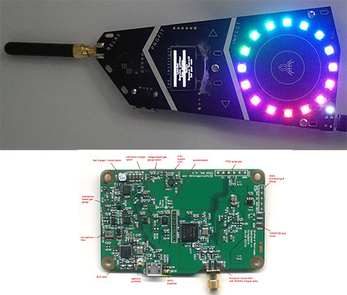 However, the only difference at a schematic level between the reference platform and the badge is the addition of 14 extra RGB LEDs, the removal of the BLE radio, and redesign of the captouch electrode pattern. Because the BOM of the badge is a strict subset of the reference design, we were able to go from a couple prototypes in advance of a private Crowd Supply campaign to 85 units delivered at the door of camp mates in about 2.5 months – and the latency of shipping units from China to front doors in the US accounts for one full month of that time.