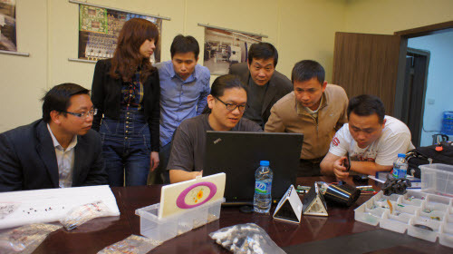 bunnie working with a factory team. Photo credit: Andrew Huang.