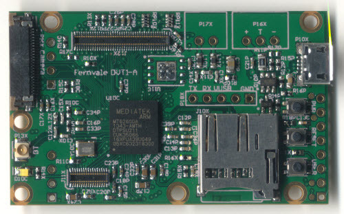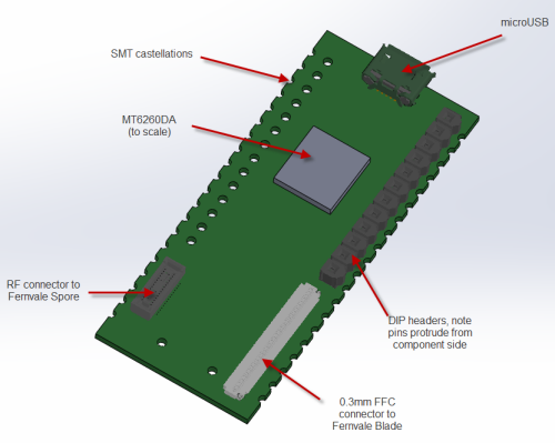 We settled eventually upon a single-sided core PCB that we call the “Fernvale Frond” which embeds the microUSB, microSD, battery, camera, speaker, and Bluetooth functionality (as well as the obligatory buttons and LED). It’s slim, at 3.5mm thick, and at 57x35mm it’s also on the small side. We included holes to mount a partial set of pin headers, spaced to be compatible with an Arduino, although it can only be plugged into 3.3V-compatible Arduino devices.
