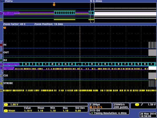 Above: Screenshot from the Tek MDO4104B-6, showing the analog trace in yellow, and the ASCII data extracted in cyan. The top quarter shows a zoomed-out view of the entire capture; one can clearly see how SPI ROM accesses in gray are punctuated with console output in cyan.
