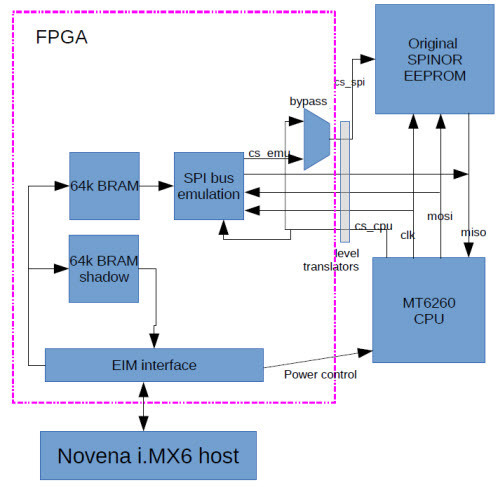 From here, we needed to speed up our measure-modify-test loop; desoldering the ROM, sticking it in a burner, and resoldering it onto the board was going to get old really fast. Given that we had previously implemented a NAND FLASH ROMulator on Novena, it made sense to re-use that code base and implement a SPI ROMulator. We hacked up a GPBB board and its corresponding FPGA code, and implemented the ability to swap between the original boot SPI ROM and a dual-ported 64kiB emulator region that is also memory-mapped into the Novena Linux host’s address space.
