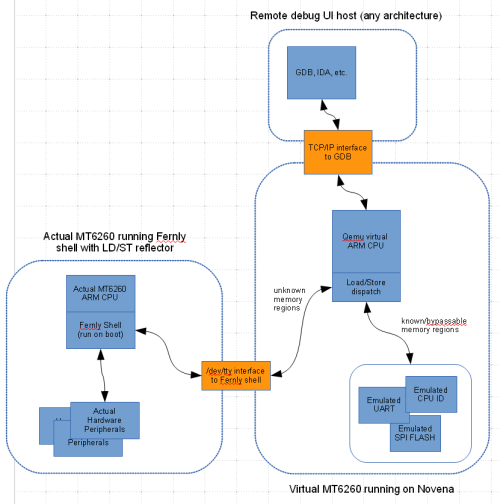 Requiring users to own a Novena ROMulator to hack on Fernvale isn't a scalable solution, and thus in order to round out the story, we had to create a complete developer toolchain. Fortunately, the compiler is fairly cut-and-dry – there are many compilers that support ARM as a target, including clang and gcc. However, flashing tools for the MT6260 are much more tricky, as all the existing ones that we know of are proprietary Windows programs, and Osmocom's loader doesn't support the protocol version required by the MT6260. Thus, we had to reverse engineer the Mediatek flashing protocol and write our own open-source tool.