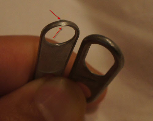 As you can see, when the pullers come around the rail, their orientation is random: some are facing right, some facing left. But the joining operation must only insert the slider into the smaller of the two holes. The tiny tab, highlighted above, allows gravity to cause all the pullers to hang in the same direction as they fall into a rail toward the left.