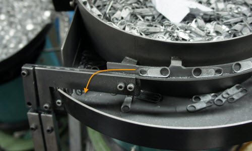 We paused the vibrapot responsible for sorting the pullers into the correct orientation for the fully automatic process, so I could take a photo of the key step: