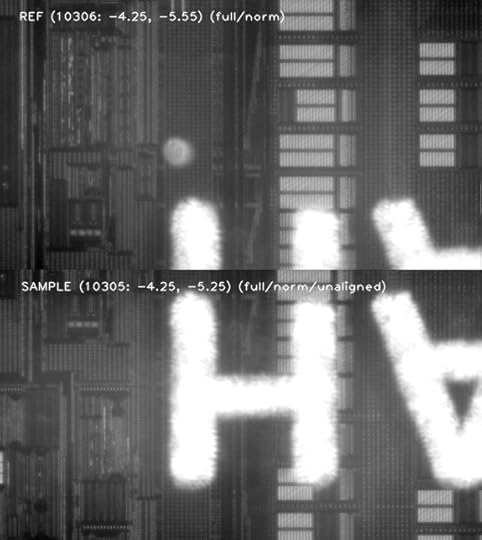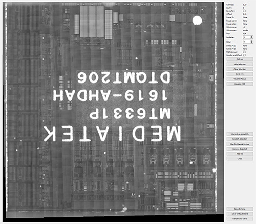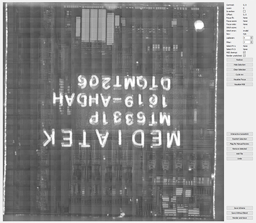 After template matching and MSE cleanup, the final alignment goes through some basic sanity checks, and if all looks good, moves on to the next tile. If something doesn’t look right – for example, the proposed offsets for the images are much larger than usual, or the template matcher found too many good solutions (as is the case on stitching together very regular arrays like RAM) – the algorithm stops and the user can manually select a new template and/or move the images around to find the best MSE fit. This will usually happen a couple of times per chip, but can be more frequent if there were focusing problems or the chip has many large, regular arrays of components.